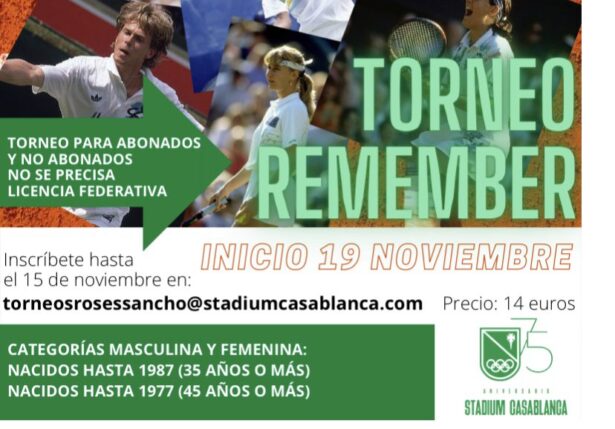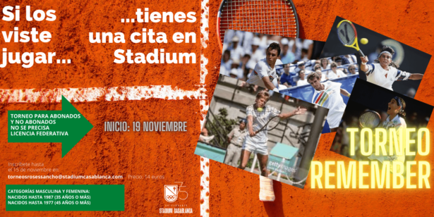 Stadium Casablanca organiza un nuevo torneo dirigido especialmente a aquellos apasionados del tenis que, por edad, guardan en la memoria puntos imposibles de Max Wilander, Steffi Graf, Ivan Lendl, Conchita Martínez, Stefan Edberg o Gabriela Sabatini. Se trata del Torneo Remember de tenis. El único requisito para participar en esta nueva competición es tener más…